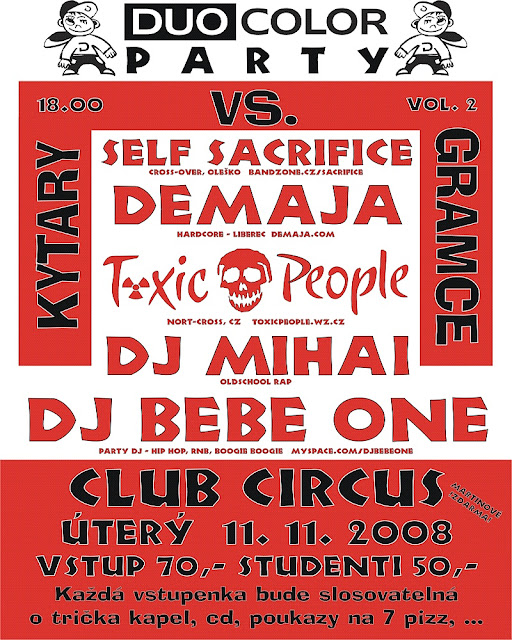 Toxic People, Demaja, Self Sacrifice, DJ Mihai a Dj Bebe. To je složení DuoColor Party II. (my s Demajou tam hrajeme v rámci NORTH HARD FACE TOUR) v ústeckém klubu Circus. Začneme v úterý 11.11. již v 18.00!! (bude to na Martina a ti budou mít vstup zadara!!). Jinak vstupné bude 70 kaček, studenti jen pajdu. A Každá vsupenka bude slosovatelná a vyhrát budete moc 7x pizzu v restauraci Krček, 2x večeři v Mexické restauraci, trička a CD Toxic People atd.!! Párty pořádá spolu s námi firma DuoColor, což je kopírovací centrum na Špitálském náměstí! A její šéf Pep-in měl také na starosti hip hopovou stage na free Tibet X.