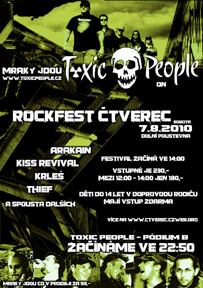 Ahoj Toxic People teame! V sobotu dáme další letní vymazlenej koncík na oblíbeném místě všech turistů severu – na dolnopoustevenstkém Čtverci! Koná se tam stejnojmený festival, který pořádá kapela Krleš. Dále vystoupí Arakain, Kiss revaivel a mnoho dalších. Alevšichni budou naše předkapely, protože my na podiu B festival zakončíme! Uvidíme se za deset minut jedenáct v kotli! Díky, čau